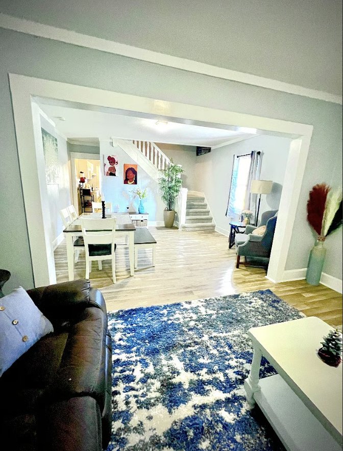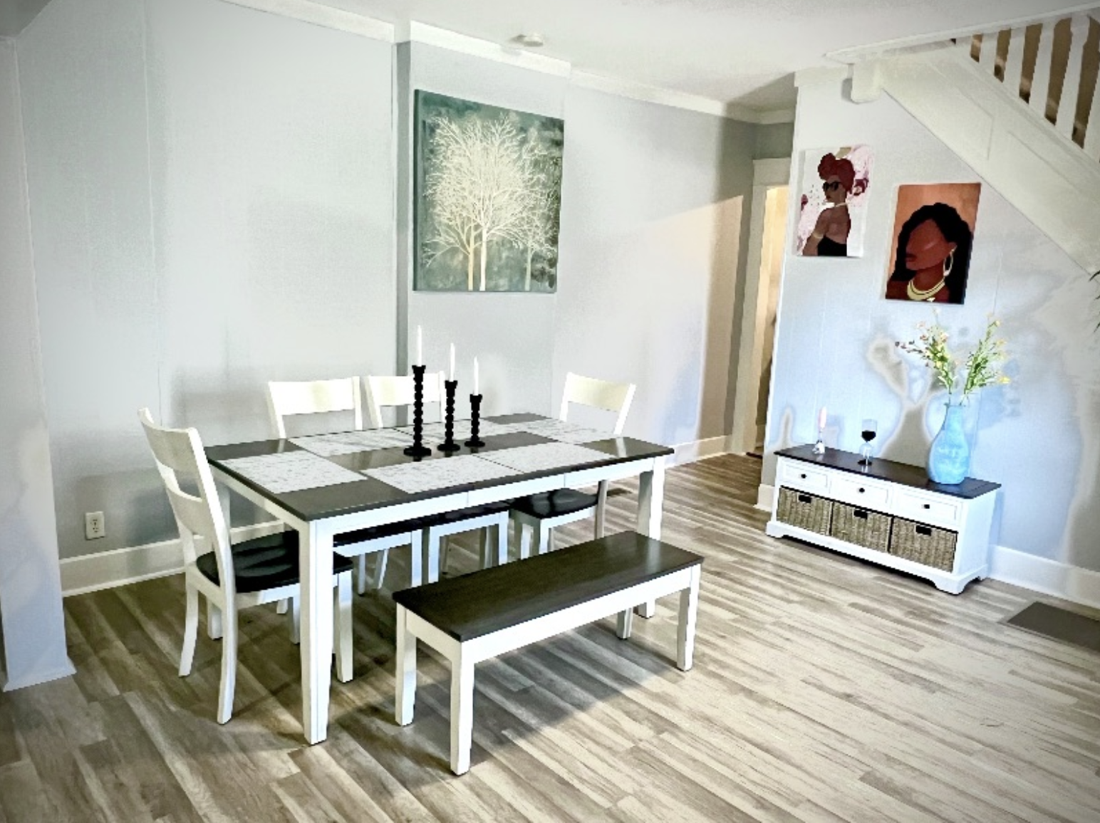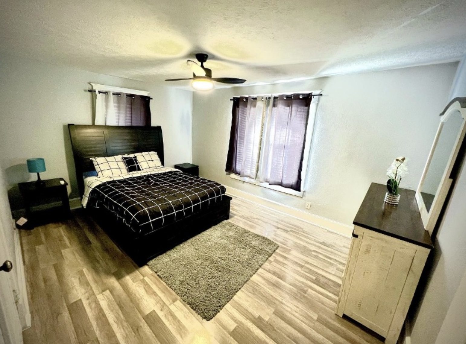 This spacious bedroom features a queen size bed, a dresser and a closet for storage. It shares a full bathroom with Bedroom A and Bedroom C which is located upstairs, and a half bath located in the kitchen downstairs.