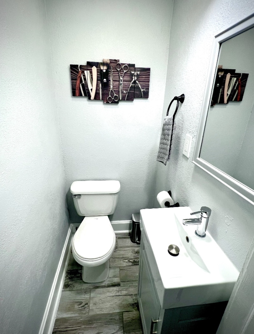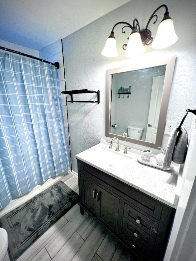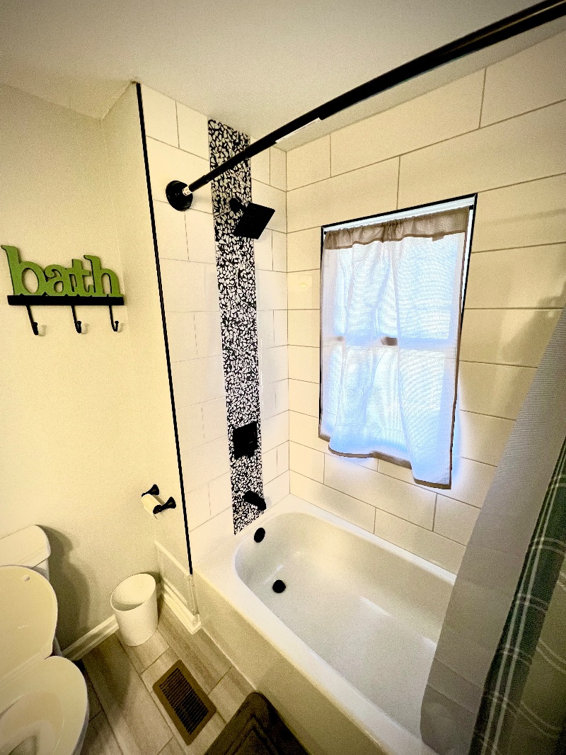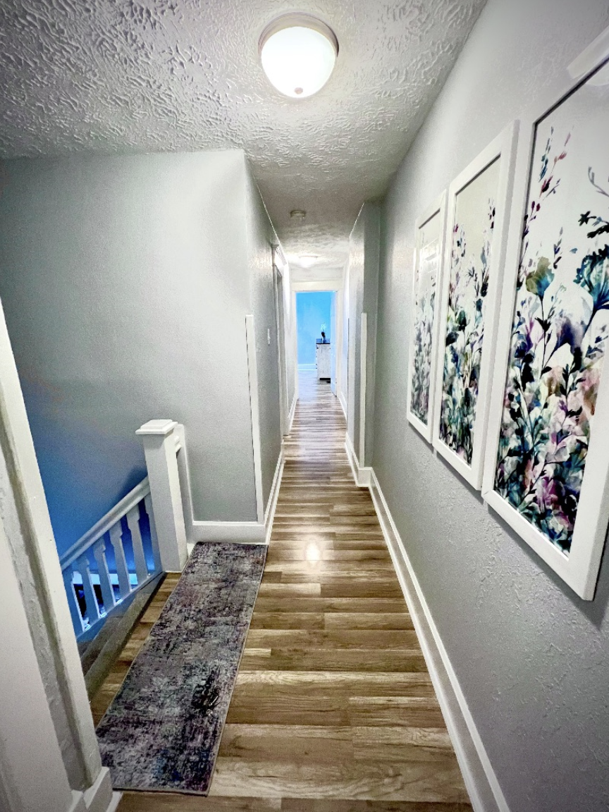 This spacious bedroom features a queen size bed, a dresser and a closet for storage. It shares a full bathroom with Bedroom A and Bedroom C which is located upstairs, and a half bath located in the kitchen downstairs.
