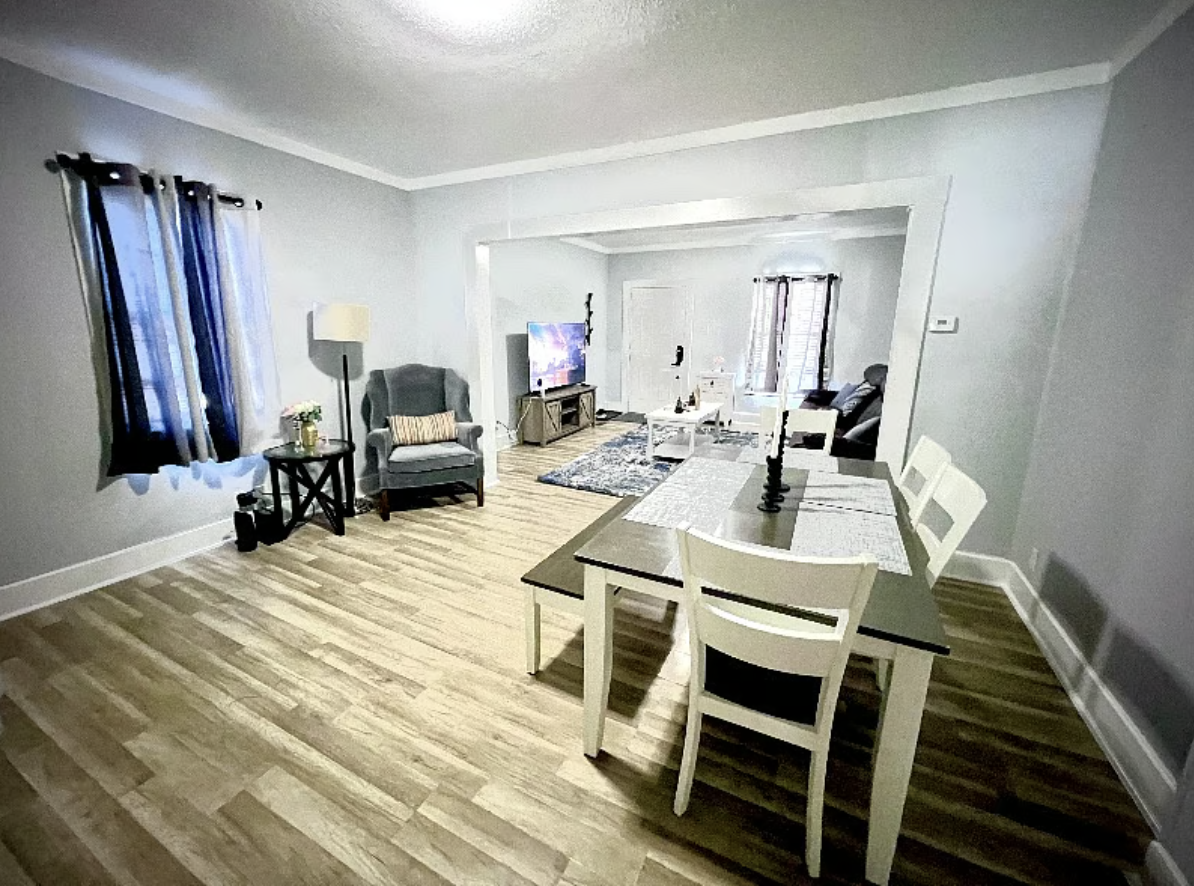 In the living room, there are comfy sofas, a big smart TV with fast internet, and you can control the temperature. The dining room table fits six people.
