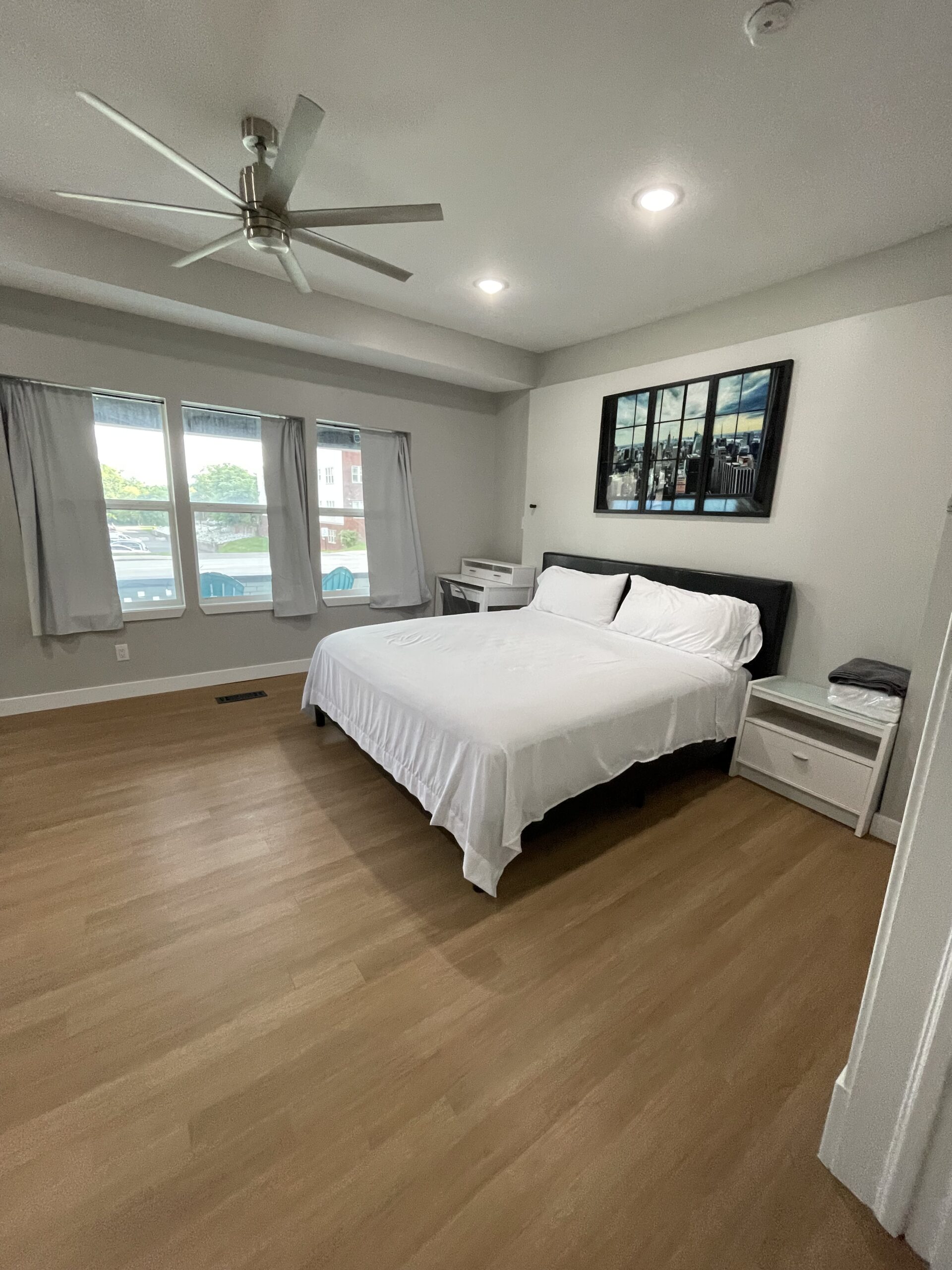 Unit 1 has a king-size bed, a TV, and a large closet. It has its own in-unit laundry and dryer and a private full bathroom with a tub.