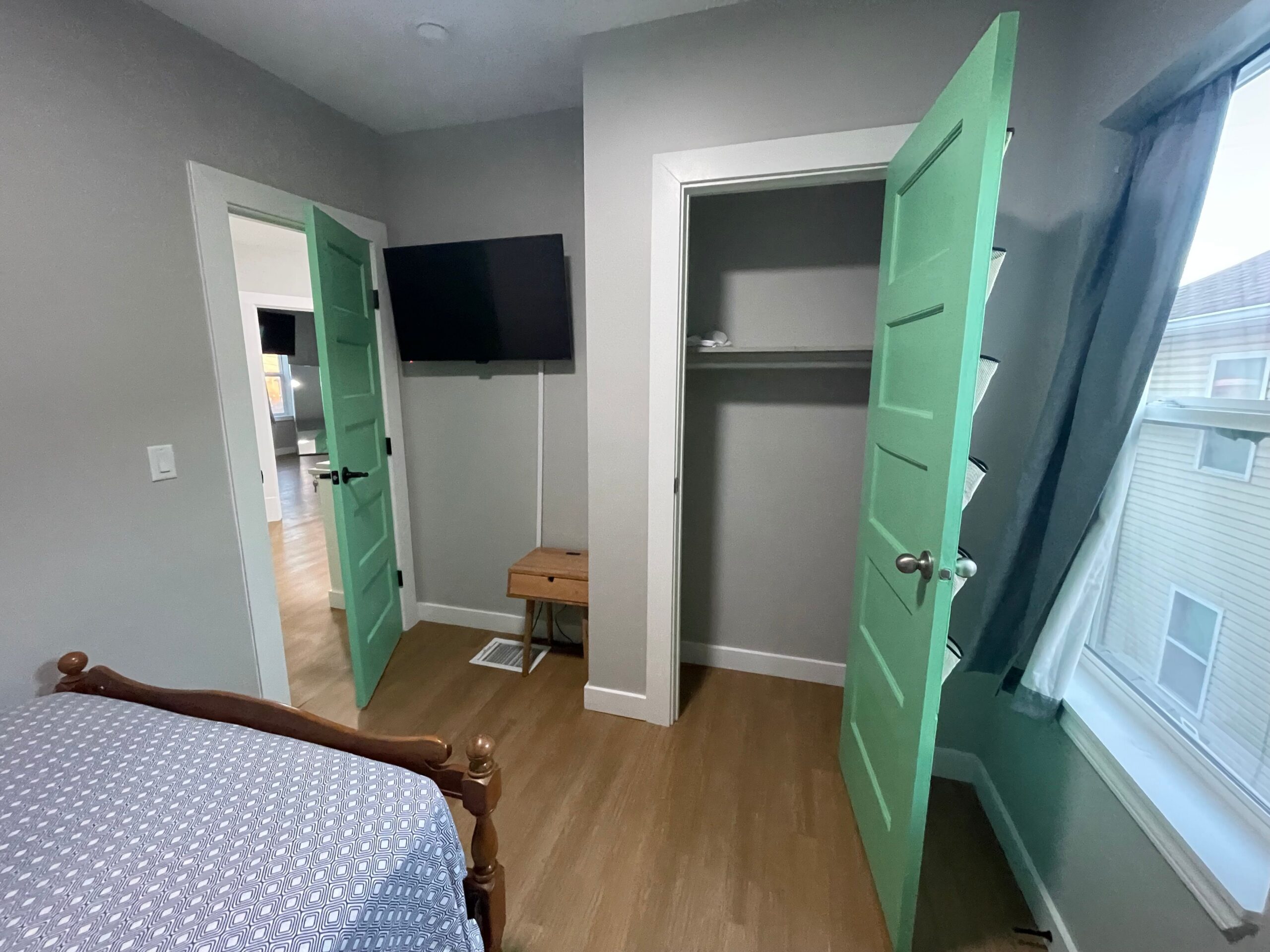 Bedroom 4 is a traveler-friendly unit that features a full-sized bed, a TV and a closet. It shares a full kitchen, laundry area, and two common bathrooms with Bedrooms 2 and 3.